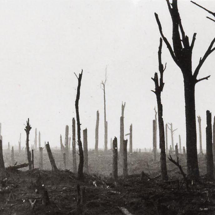 Like inverted stakes in the hearts of France and Flanders, the splintered trees from the fields of battle stand as rooted silhouettes. Their splinters litter the ground on which men once walked, crawled or ran; the belligerent skelfs, large and small, hurling about tearing and ripping the flesh, piercing the souls of men. Amongst the metal fragments, aimed engineering, gas and shrapnel balls these organic shards of nature took their toll. They, the soldiers, from all the pictures – seem to live in a world of black and white, with gray washes suggesting a continual haze from which men emerge between the trunks. The colour gone, leached from the landscape, drained into the ground where the roots of seemingly dead trees struggle to find a source of regeneration.